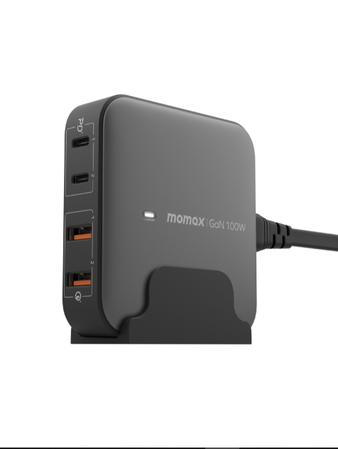 شاحن مكتبي 100 وات 4 منافذ بتقنية جان لون أسود من موماكس