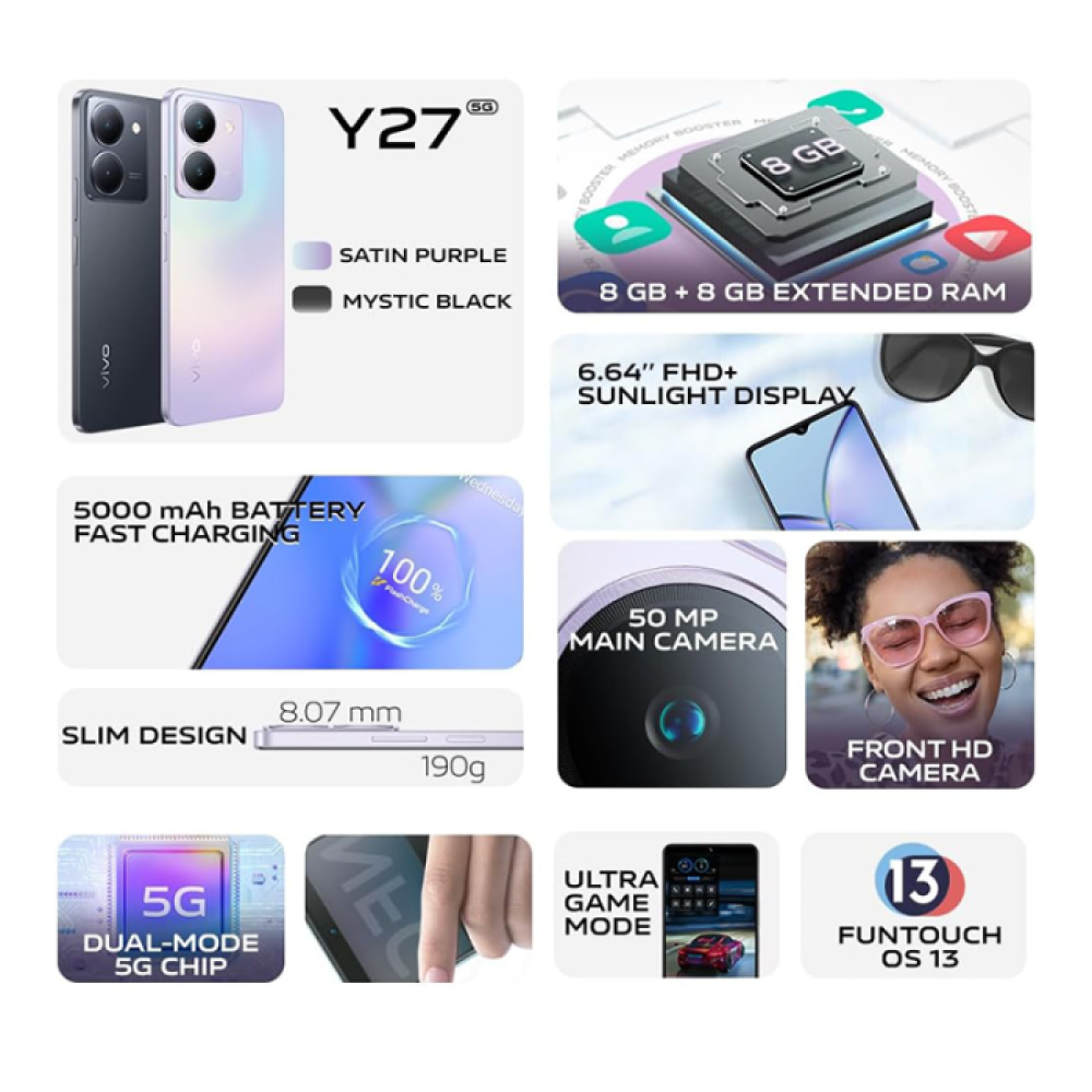 VIVO- فيفو-Y27 بذاكرة داخلية 256 جيجابايت / 8 جيجابايت رام بتقنية 5G - بنفسجي ساتان