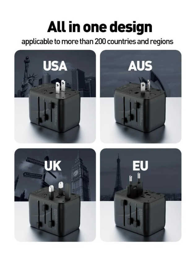 • تصميم دولي متعدد القوابس: متوافق مع مقابس الكهرباء في أكثر من 150 دولة، مما يجعله مثاليًا للمسافرين.